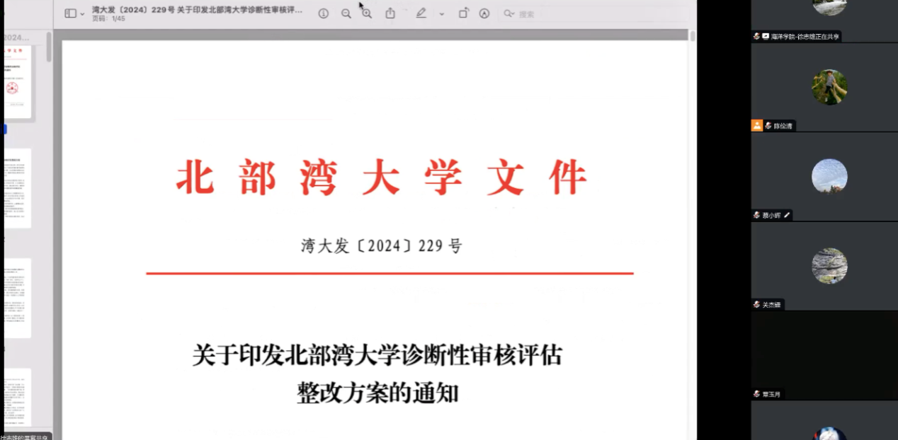 此次会议由陈俭清副院长主持,院长助理徐志雄带领全院教职工学习本科教育教学审核评估指标体系、工作指南、应知应会、诊断性审核评估整改方案和整改工作任务等内容,以及《北部湾大学课程教学管理办法》、《北部湾大学本科教学管理工作规范》等相关制度文件。会议还通报了《海洋学院诊断性审核评估整改方案》和《海洋学院诊断性审核评估整改工作任务》。