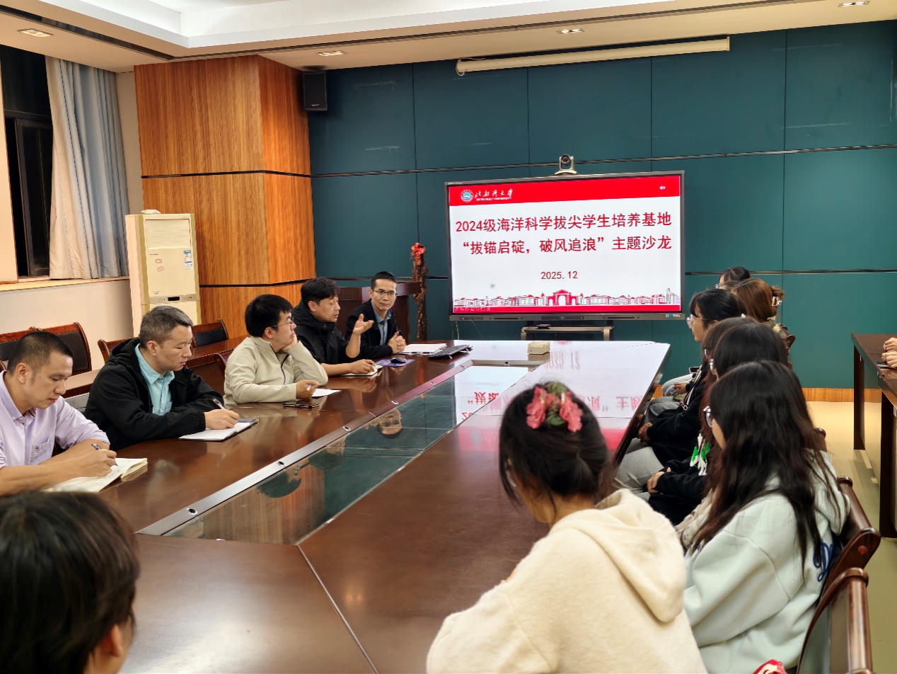 2025年12月16日,海洋学院在7A-229会议室举行2024级海洋科学拔尖学生培养基地“拔锚启碇,破风追浪”主题沙龙活动。海洋学院副院长陈俭清、院长助理徐志雄、海洋科学系主任廖日权、副主任李松霖、岳涛及拔尖班班主任吴宙与全体拔尖班同学面对面交流,畅谈学习收获与未来规划。