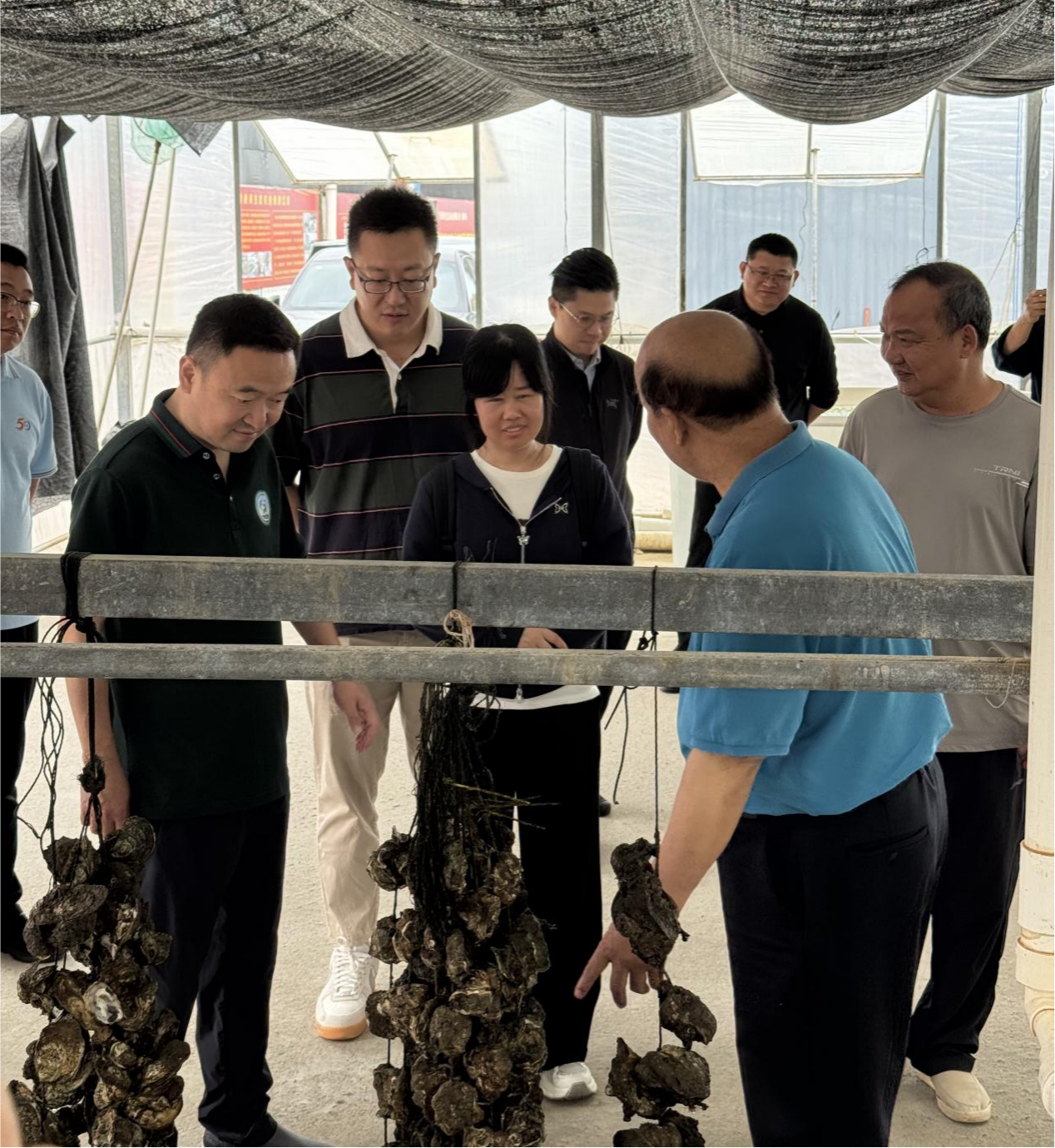 张卫东董事长向调研组介绍了企业在苗种高效繁育、生态中间培育、亲本生态促熟等核心技术领域的突破,以及对虾精准饲料高效养殖、尾水生态处理与循环利用等绿色养殖技术的产业化应用。现场还展示了与我校与中科院海洋所的合作成果—近江牡蛎速生耐盐新品系“广福1号”、香港牡蛎三倍体等成果。