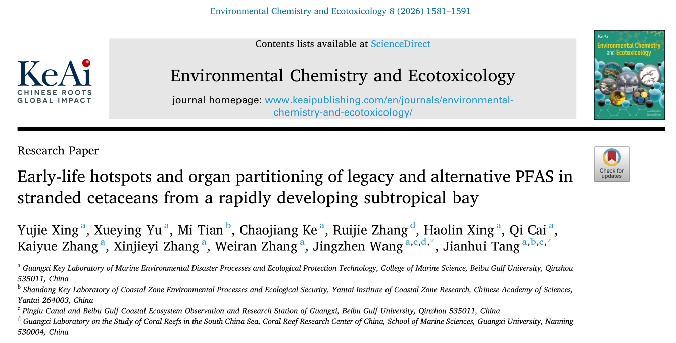 近日,我院王京真教授团队与中科院烟台海岸带研究所唐建辉研究员合作,在环境科学与生态学中科院一区Top期刊《Environmental Chemistry and Ecotoxicology》(即时影响因子 IF = 12)发表研究论文“Early-life hotspots and organ partitioning of legacy and alternative PFAS in stranded cetaceans from a rapidly developing subtropical bay”,论文第一作者为我院研究生邢宇杰。该研究以北部湾搁浅鲸豚为对象,系统揭示了传统及替代型全氟和多氟烷基物质(PFAS)在鲸豚体内的多组织分配特征,为区域海洋生态保护、新污染物管控以及近岸食物链安全评估提供了重要科学依据。