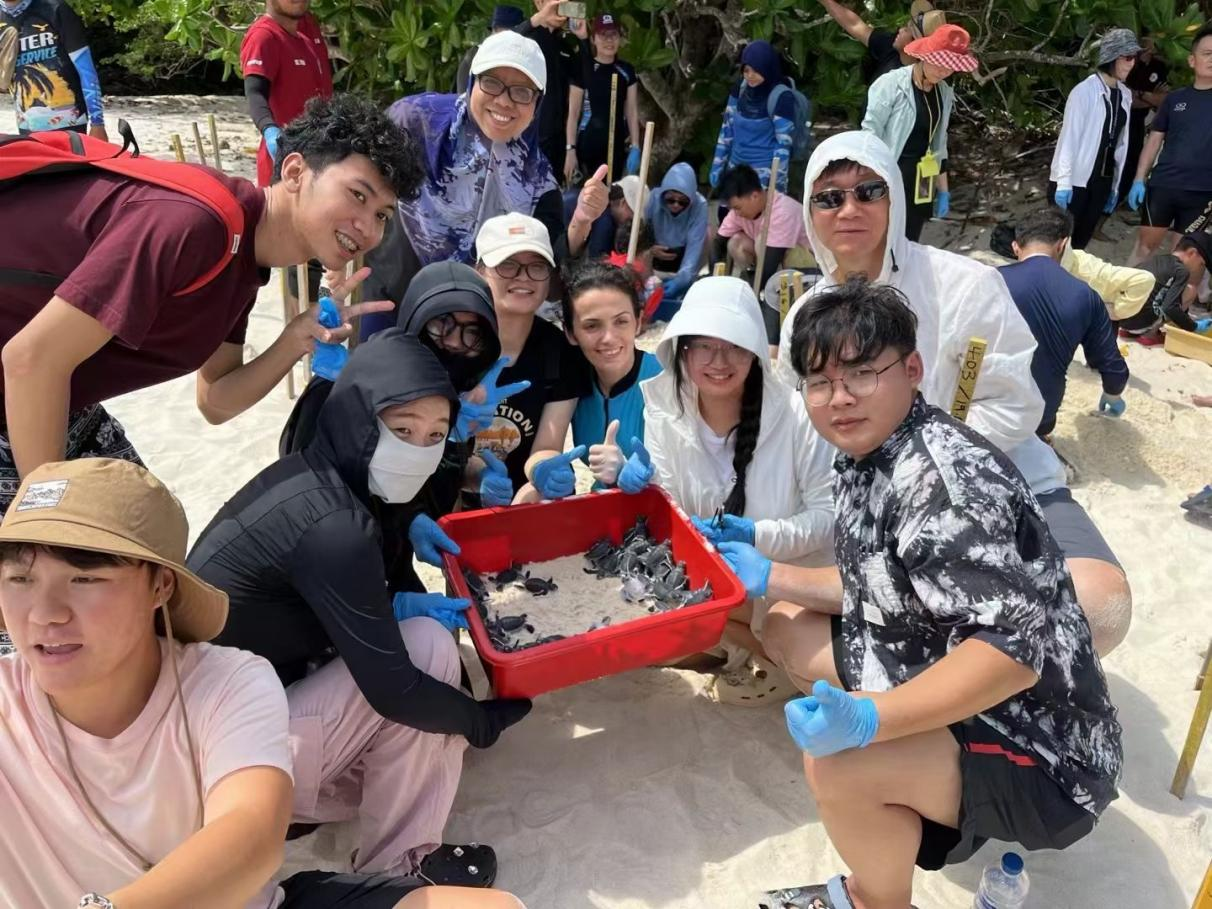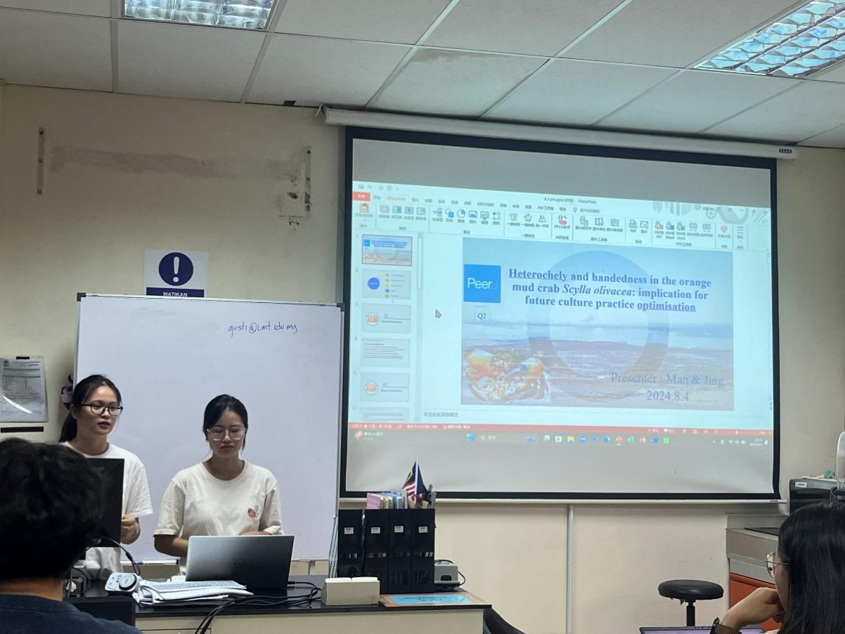 交流期间,学生们参观了马来西亚丁加奴大学校内养殖基地,深入了解了泥蟹、珊瑚、石斑鱼、鲎等多种海洋生物的人工养殖情况,还有幸参与了当地热浪岛的小海龟放流活动。实习结束前,学生们进行了全英学习总结汇报。