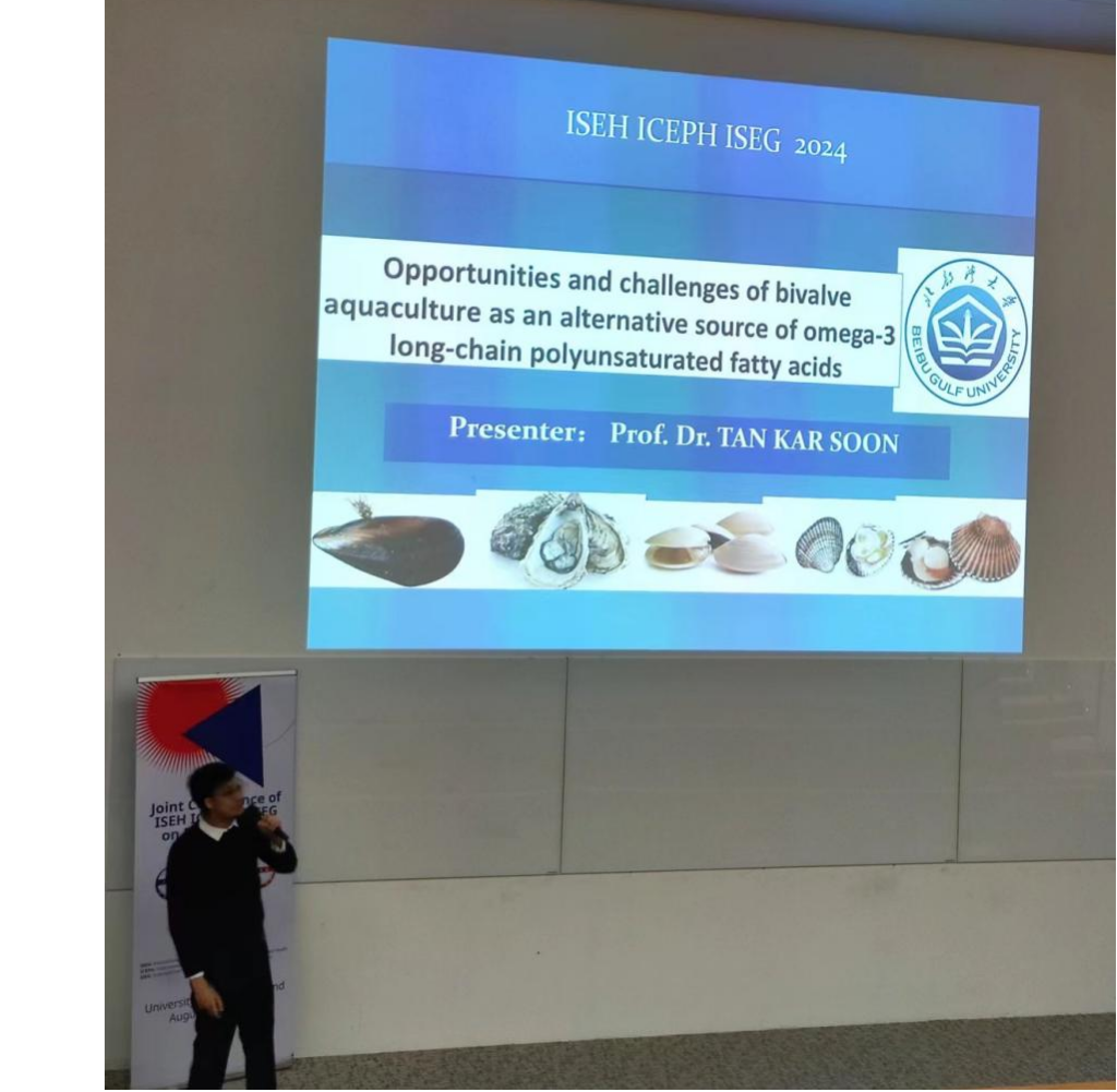 会上,邓嘉信研究员做了题为“双壳类水产养殖作为Omega-3长链多不饱和脂肪酸替代来源的机遇与挑战”的主题报告,介绍了双壳类水产养殖作为n-3多不饱和脂肪酸(n-3 LC-PUFA)重要天然来源的潜力,阐述了双壳类水产养殖的现状及其主要挑战,并呼吁全球沿海国家扩大双壳类水产养殖的规模,以满足日益增长的食品营养需求。廖日权副教授展示了“中国北部湾PHEs的分布特征和迁移转化”的研究进展,介绍了北部湾的海洋生态环境、北部湾大学的地理位置和海洋优势学科。