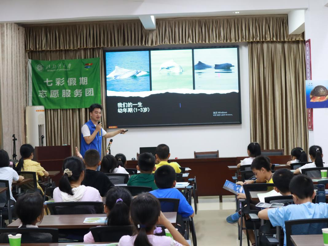 服务团在三宣堂社区党群服务中心向三宣堂社区的30余名小朋友科普中华白海豚