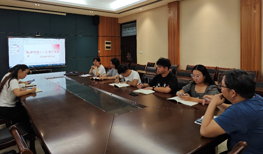 2024年11月15日,海洋学院在7A-229会议室召开了十一月学工例会。会议由学院党委副书记王倩主持,所有专兼职辅导员参会。