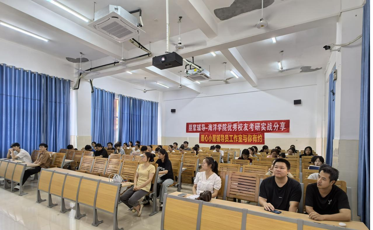 为助力海洋学院2026届毕业生明确考研方向、掌握高效备考策略、提升考研竞争力,海洋学院携手“暖心小屋”辅导员工作室于6月9日分别在13-110、12-112、7B-112教室举办三场考研经验分享会。“暖心小屋”辅导员工作室负责人彭仁芝,海洋学院辅导员、班主任也亲临现场,与我院200多名学生共同参与分享会。