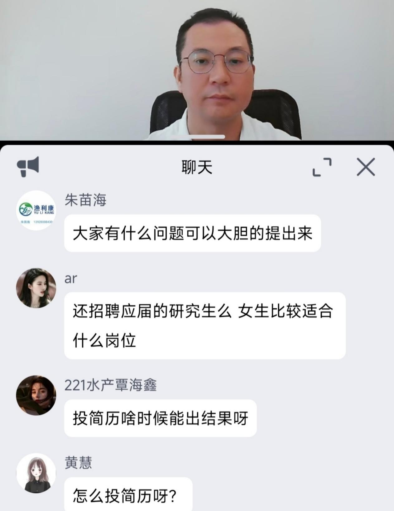 渔利康水产科技(珠海)有限公司是一家集水产动保、水产种苗、水产饲料、水产养殖为一体的综合科技型企业。本次线上宣讲,王总以视频、PPT和讲解结合的方式向我院毕业生介绍了渔利康的基本情况、公司特色、招聘岗位、晋升途径及相关要求等。之后,同学们就薪酬福利、岗位适配等问题积极提问,王总一一解答。最后,本次招聘会在愉快的气氛中结束。